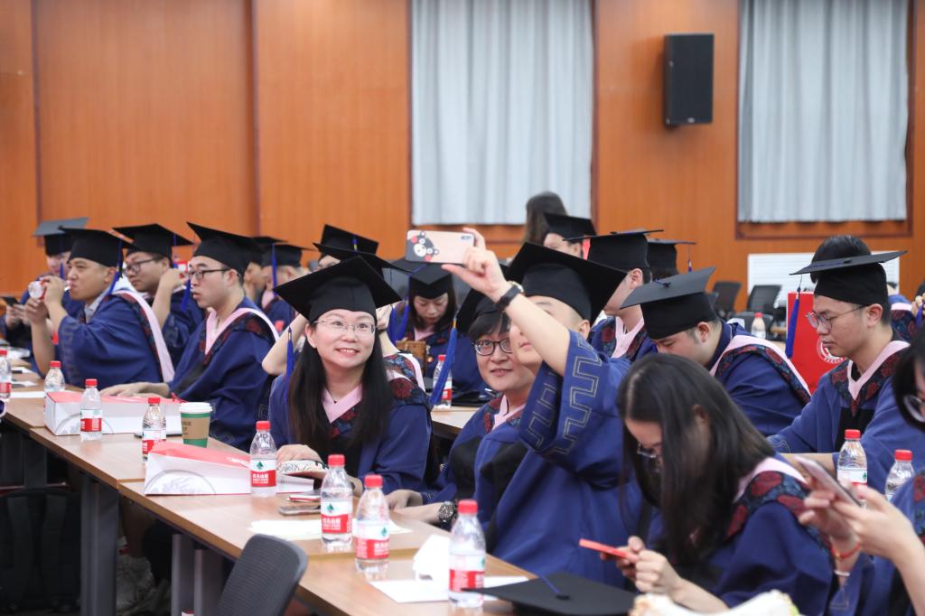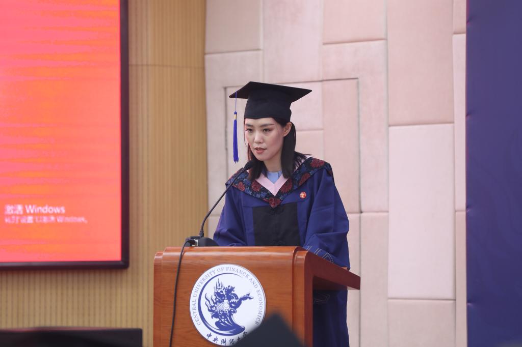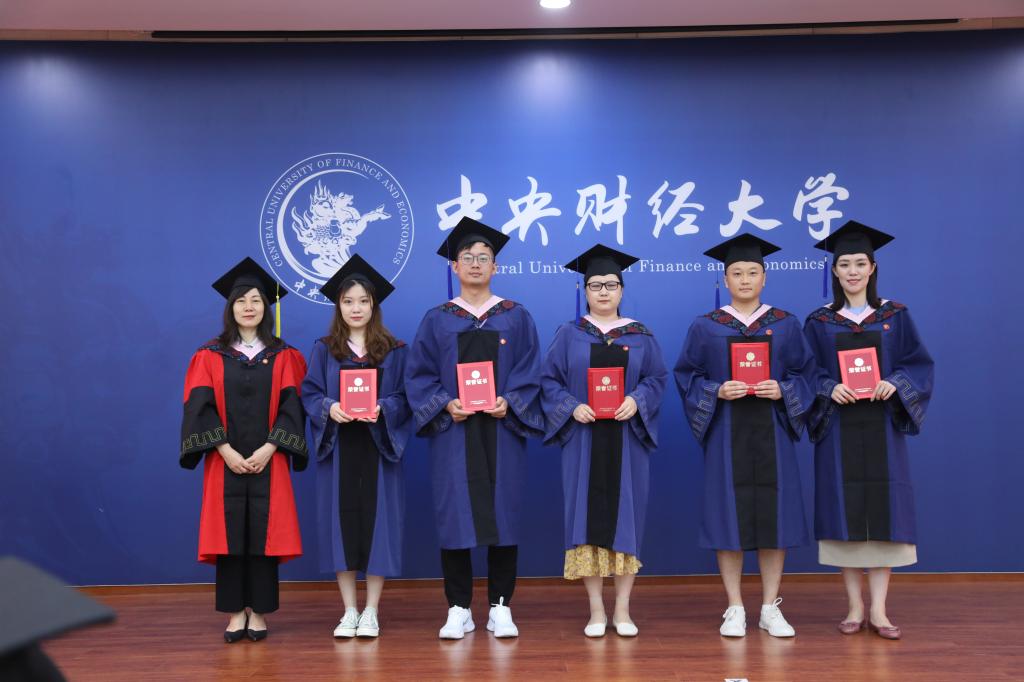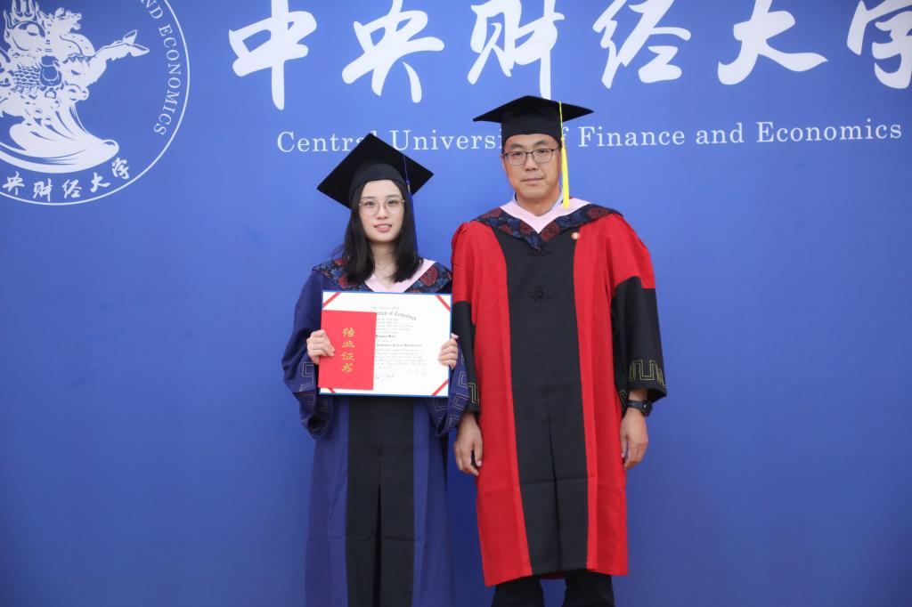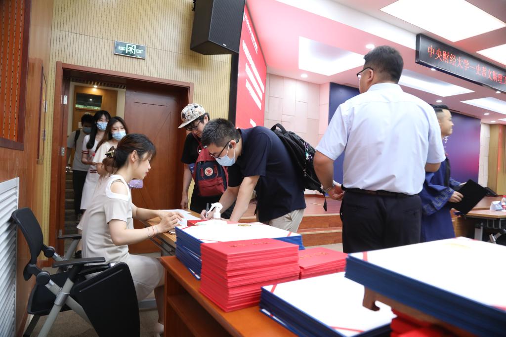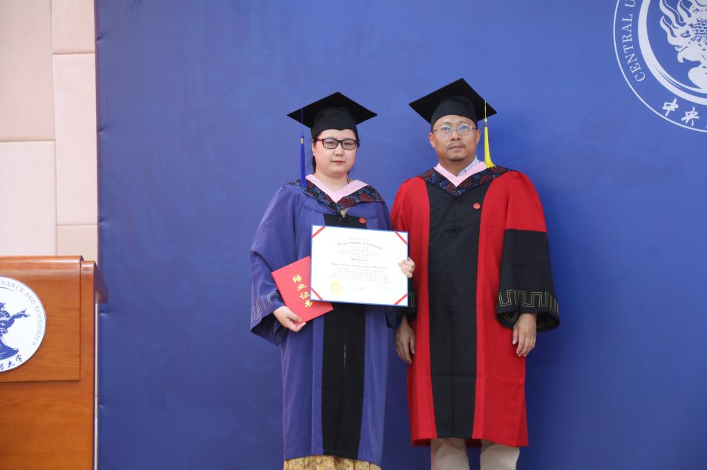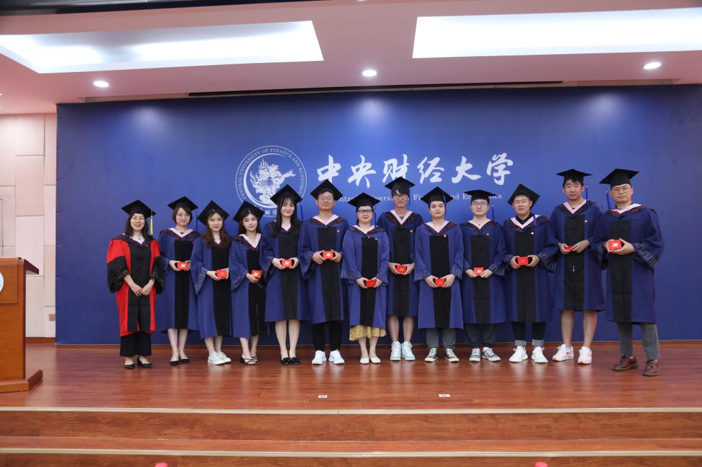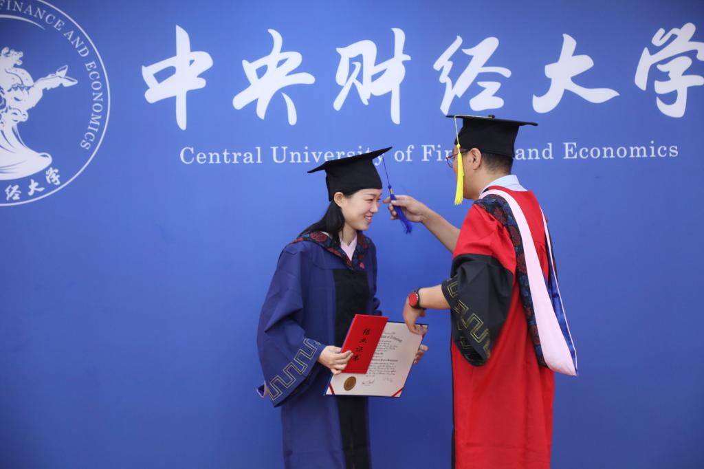 接下来进行的是学位授予仪式。毕业生们逐一上台,陈俊华副经理为同学们颁发美方学位证书和中财结业证书,刘志东经理为毕业生们拨穗正冠。