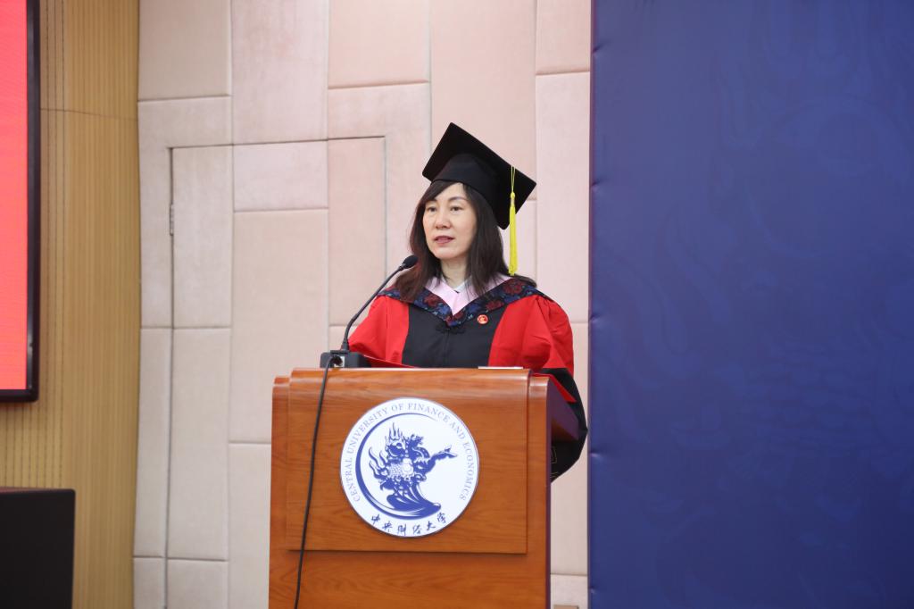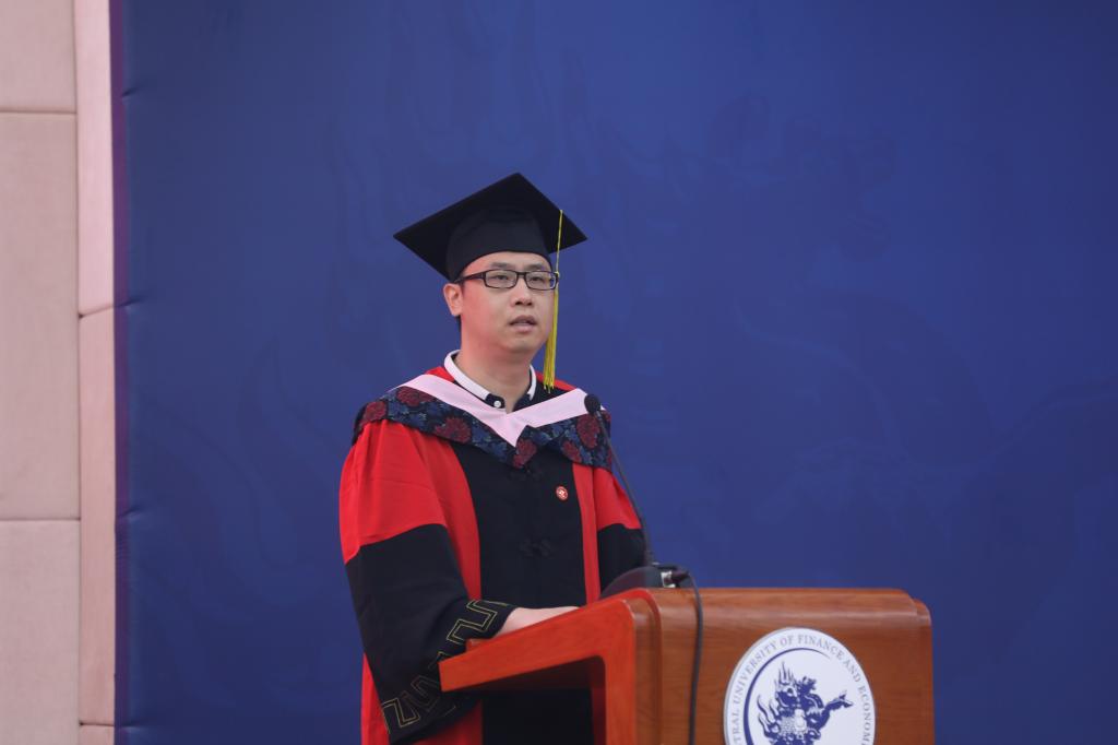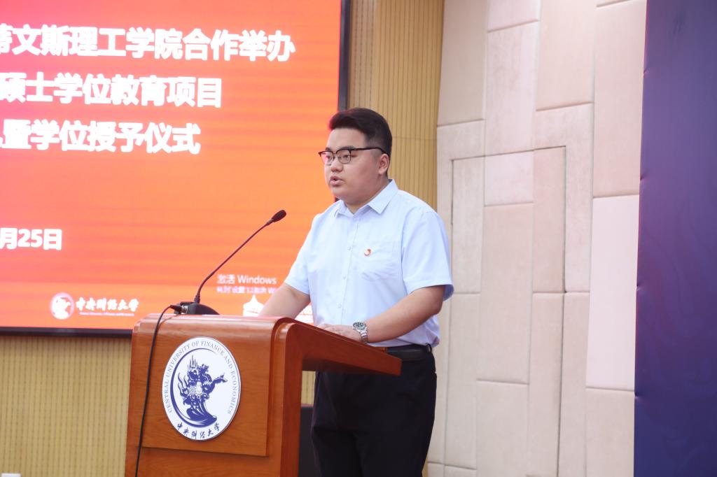 校国际合作处副处长、公司工程管理系王昊副教授作为中方教师代表致辞。王昊老师首先祝贺同学们经过努力和付出,终于收获了丰硕的成果。他期望同学们,在今后的工作生活中能坚持前进的动力,更加勇敢地应对未来的挑战。王老师勉励大家要终身学习,充实自我,在百年未有之大变局中,跟上时代的发展脚步,把握时代的脉搏。