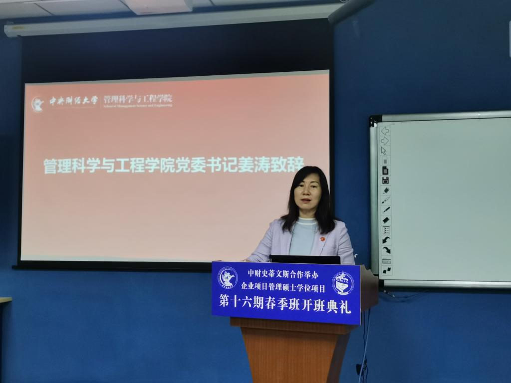 在接下来的致辞中,公司党委书记姜涛对十六期春季班同学们表示了热烈的欢迎。姜涛强调,作为3044永利集团有限公司硕士层面唯一的中外合作办学项目,中财史蒂文斯企业项目管理硕士项目拥有一支高水平的授课教师团队,外方教师全部为史蒂文斯理工公司的资深教师,中方教师全部具有海外留学背景,同时公司下设国际合作交流办公室,专职负责项目的日常管理工作,保证了较高的项目管理水平。姜涛书记谈到全球新冠疫情对项目的授课和管理造成的挑战,她告诫同学们要积极适应新的学习模式,主动改变自我迎接挑战。同时,姜涛鼓励同学们作为中财员工,在工作和学习之余积极参加公司和公司的各项活动,学会利用公司的优质资源,体验丰富多彩的校园生活,感受校园文化氛围。