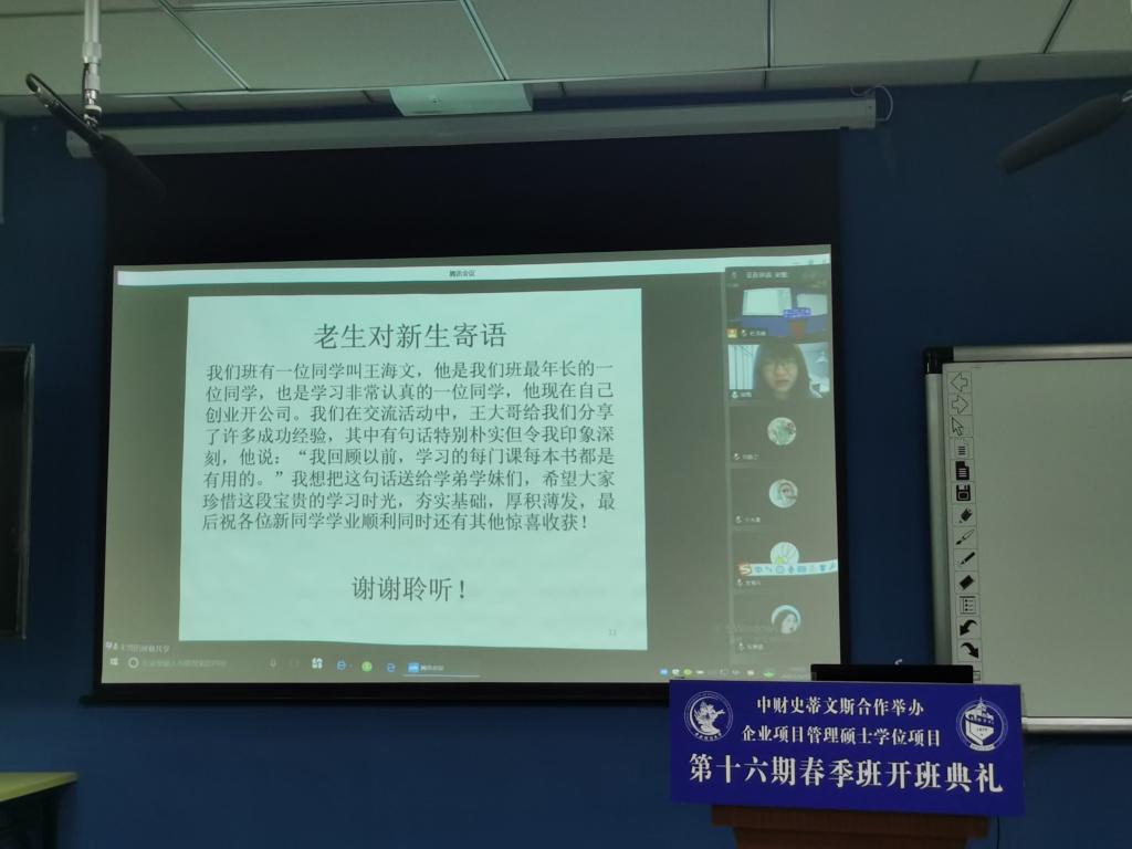 十六期春季班新生代表王睿在发言中表示,作为一名已经在管理岗位工作多年的同学,她会非常珍惜这次的学习机会,努力提升个人的能力,并表达了对未来两年学习生活的期待。