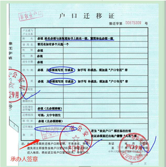 6.户口迁移证编号一般以迁移证右上角为准,有特殊备注,以备注为准;